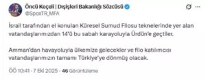 Dışişleri Bakanlığı Sözcüsü Öncü Keçeli, İsrail tarafından alıkonulan Türk vatandaşlarından 14’ünün Ürdün’e geçiş yaptığını ve tamamının Türkiye’ye döneceğini açıkladı.