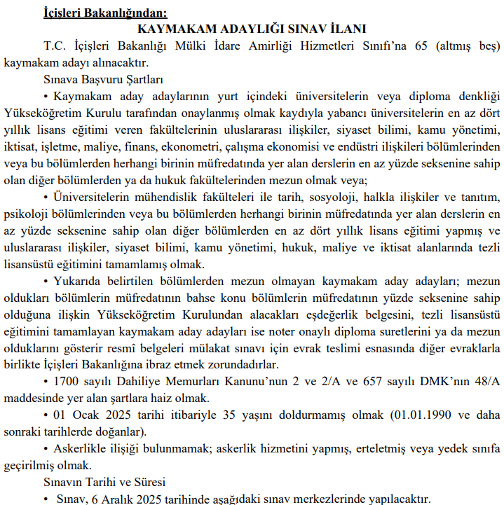2025 YILI KAYMAKAM ADAYLIĞI SINAV İLANI